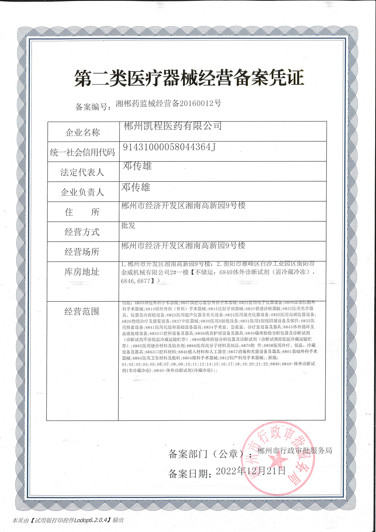 第二類醫(yī)療器械經營備案憑證:湘郴藥監(jiān)械經營備20160012號